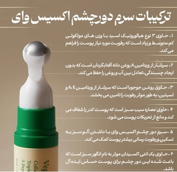 سرم دور چشم اکسیس وای، راه حل ایده‌آل برای مبارزه با چین و چروک، پف و حلقه‌های تیره پوست نازک و حساس دور چشم است. این سرم با فرمولاسیون منحصر به فرد برگرفته شده از عصاره طبیعی میوه، غنی از Vit C و اسید هیالورونیک، روغن دانه آفتابگردان و جوجوبا به آرامی جذب پوست می‌شود و با مرطوب کردن نواحی خشک اطراف چشم موجب افزایش خاصیت ارتجاعی و بهبود چین و چروک پوست می‌شود و پوست را تغذیه و روشن می‌کند. این سرم دارای اپلیکاتور چشم “CoolTouch” منحصر به فرد، برای مراقبت 360 درجه و ماساژ راحت، مناسب حتی برای حساس ترین پوست‌ها می‌باشد.